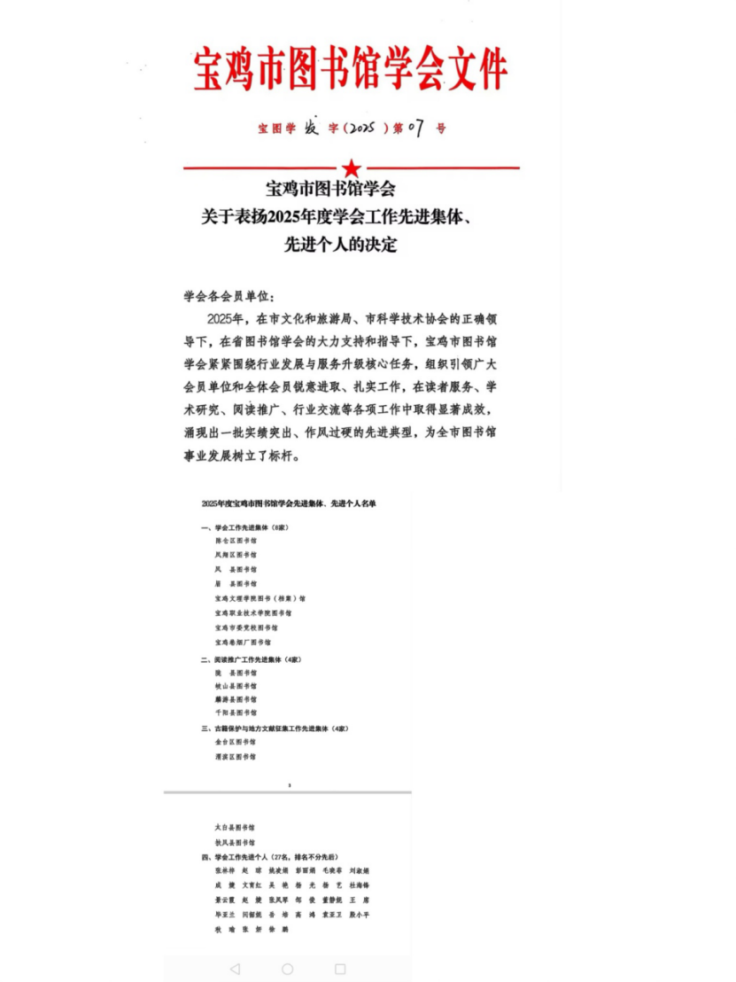 会议还审议通过了2025年度学会先进单位和个人推荐名单。图书(档案)馆荣获2025年市图书馆学会工作先进集体,彭丽娟、毛晓菲、刘淑娟荣获学会工作先进个人称号。